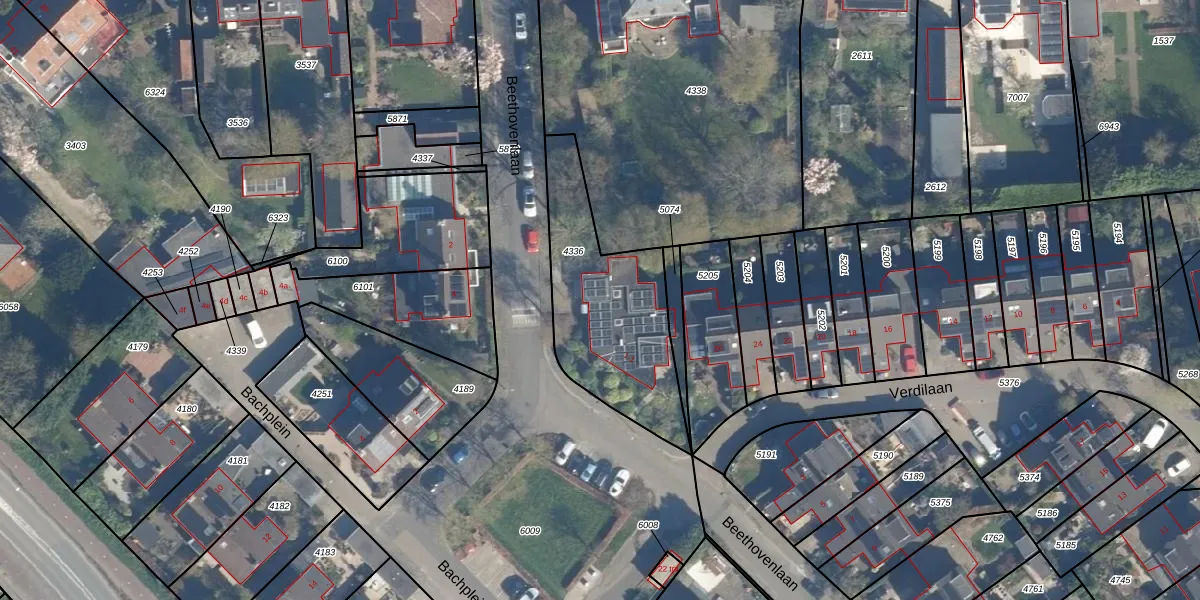 Het perceel waarop Beethovenlaan 1-2 staat heeft een oppervlakte van 657 m². Dit is een groot perceel. De perceeloppervlakte wordt geregistreerd door het Kadaster. Gedetailleerde informatie over de maten van dit perceel kunt u vinden in het rapport Kadastrale kaart met maatvoering van Beethovenlaan 1-2.