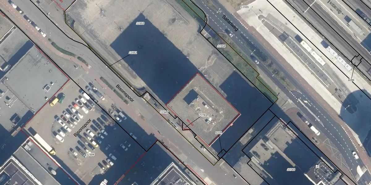 Het perceel waarop Bisonspoor 380 staat heeft een oppervlakte van 5419 m². Dit is een zeer groot perceel. De perceeloppervlakte wordt geregistreerd door het Kadaster. Gedetailleerde informatie over de maten van dit perceel kunt u vinden in het rapport Kadastrale kaart met maatvoering van Bisonspoor 380.