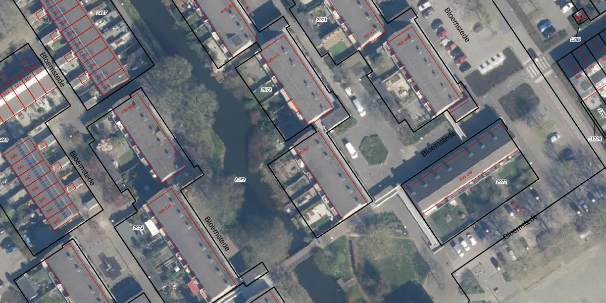 Het perceel waarop Bloemstede 438 staat heeft een oppervlakte van 1946 m². Dit is een zeer groot perceel. De perceeloppervlakte wordt geregistreerd door het Kadaster. Gedetailleerde informatie over de maten van dit perceel kunt u vinden in het rapport Kadastrale kaart met maatvoering van Bloemstede 438.