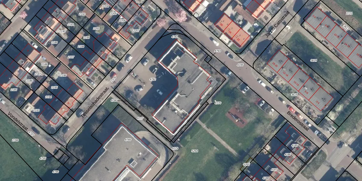 Brederostraat 1-10 is gelegen op kadastraal perceel MSV00A4782. Deze kadastrale aanduiding is uniek en wordt gebruikt door het Kadaster om eigendomsrechten en andere zakelijke rechten vast te leggen. Het perceel maakt onderdeel uit van de kadastrale gemeente Maarsseveen.
