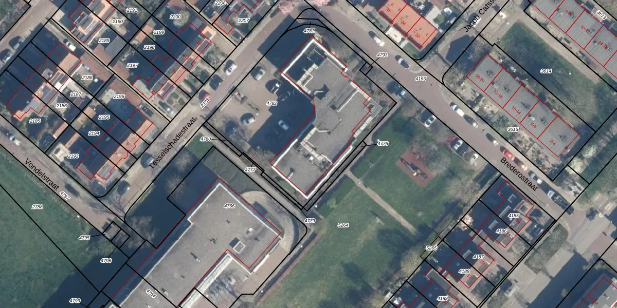 Brederostraat 1-14 is gelegen op kadastraal perceel MSV00A4782. Deze kadastrale aanduiding is uniek en wordt gebruikt door het Kadaster om eigendomsrechten en andere zakelijke rechten vast te leggen. Het perceel maakt onderdeel uit van de kadastrale gemeente Maarsseveen.