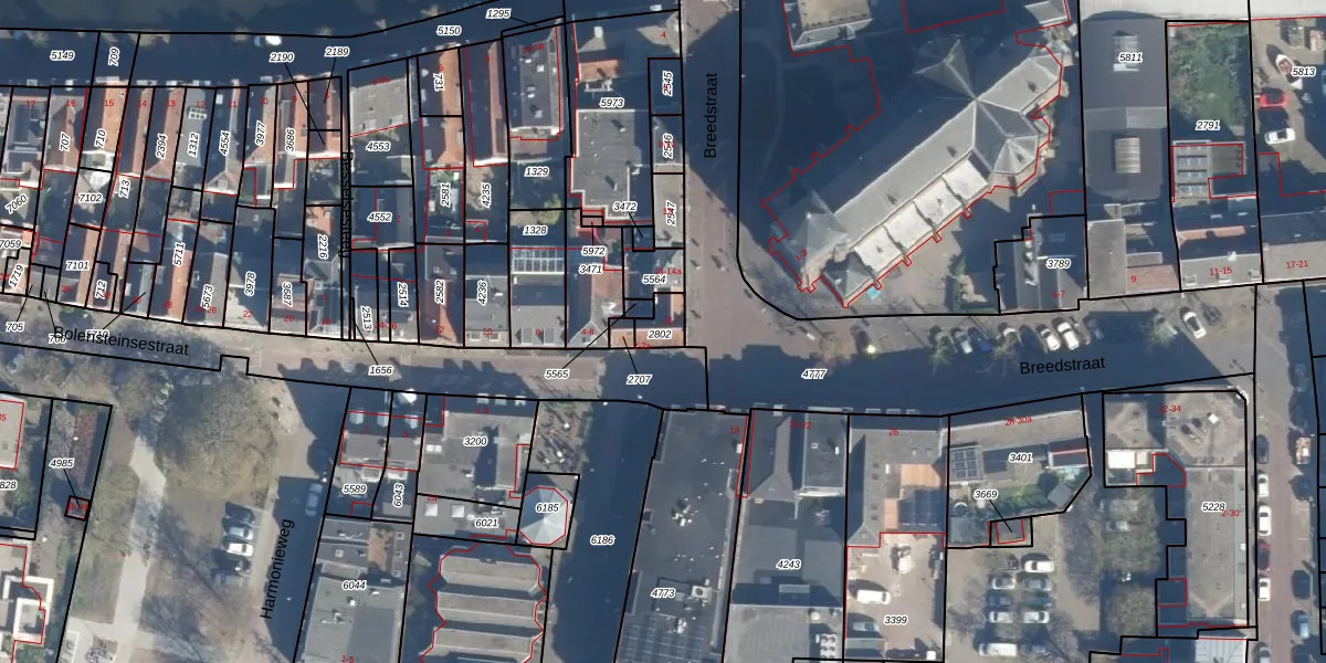 Het perceel waarop Breedstraat 16 staat heeft een oppervlakte van 52 m². Dit is een klein perceel. De perceeloppervlakte wordt geregistreerd door het Kadaster. Gedetailleerde informatie over de maten van dit perceel kunt u vinden in het rapport Kadastrale kaart met maatvoering van Breedstraat 16.
