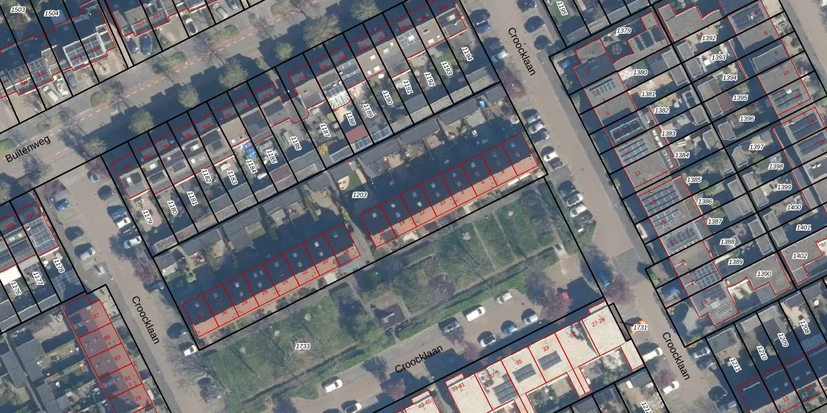 Het perceel waarop Croocklaan 12 staat heeft een oppervlakte van 2385 m². Dit is een zeer groot perceel. De perceeloppervlakte wordt geregistreerd door het Kadaster. Gedetailleerde informatie over de maten van dit perceel kunt u vinden in het rapport Kadastrale kaart met maatvoering van Croocklaan 12.