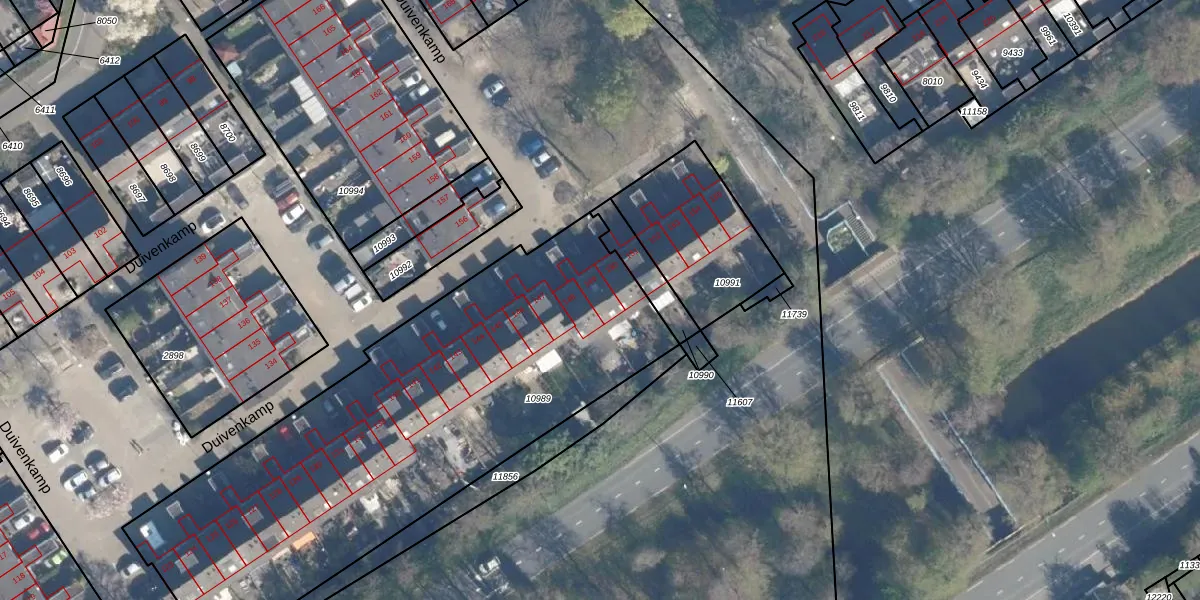 Het perceel waarop Duivenkamp 149 staat heeft een oppervlakte van 2565 m². Dit is een zeer groot perceel. De perceeloppervlakte wordt geregistreerd door het Kadaster. Gedetailleerde informatie over de maten van dit perceel kunt u vinden in het rapport Kadastrale kaart met maatvoering van Duivenkamp 149.