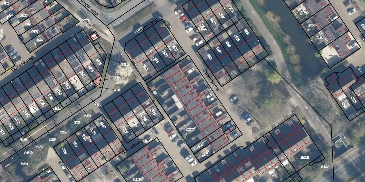 Het perceel waarop Duivenkamp 164 staat heeft een oppervlakte van 1185 m². Dit is een zeer groot perceel. De perceeloppervlakte wordt geregistreerd door het Kadaster. Gedetailleerde informatie over de maten van dit perceel kunt u vinden in het rapport Kadastrale kaart met maatvoering van Duivenkamp 164.