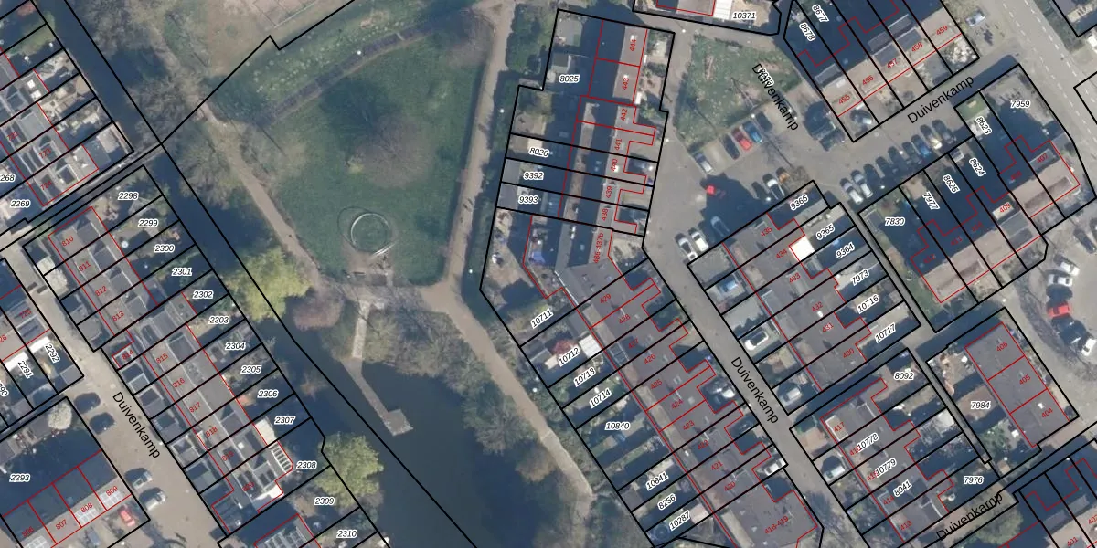 Het perceel waarop Duivenkamp 437-a staat heeft een oppervlakte van 456 m². Dit is een groot perceel. De perceeloppervlakte wordt geregistreerd door het Kadaster. Gedetailleerde informatie over de maten van dit perceel kunt u vinden in het rapport Kadastrale kaart met maatvoering van Duivenkamp 437-a.