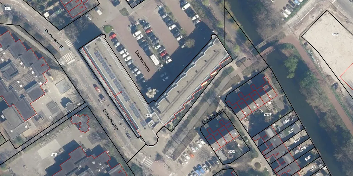 Het perceel waarop Duivenkamp 543-29 staat heeft een oppervlakte van 1982 m². Dit is een zeer groot perceel. De perceeloppervlakte wordt geregistreerd door het Kadaster. Gedetailleerde informatie over de maten van dit perceel kunt u vinden in het rapport Kadastrale kaart met maatvoering van Duivenkamp 543-29.