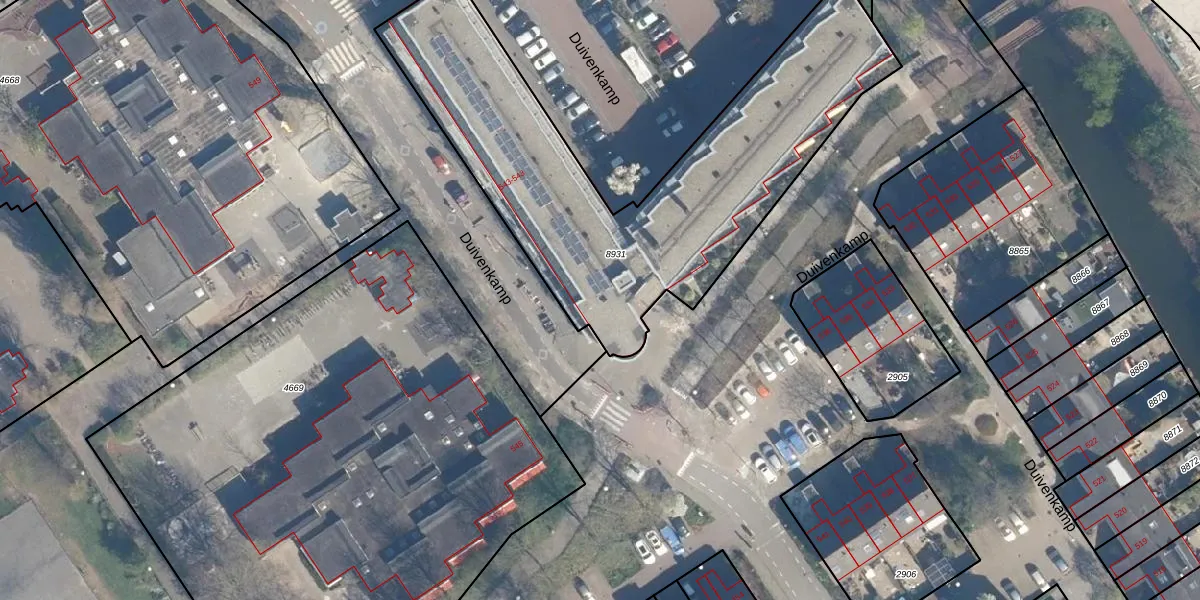 Het perceel waarop Duivenkamp 543-23 staat heeft een oppervlakte van 1982 m². Dit is een zeer groot perceel. De perceeloppervlakte wordt geregistreerd door het Kadaster. Gedetailleerde informatie over de maten van dit perceel kunt u vinden in het rapport Kadastrale kaart met maatvoering van Duivenkamp 543-23.