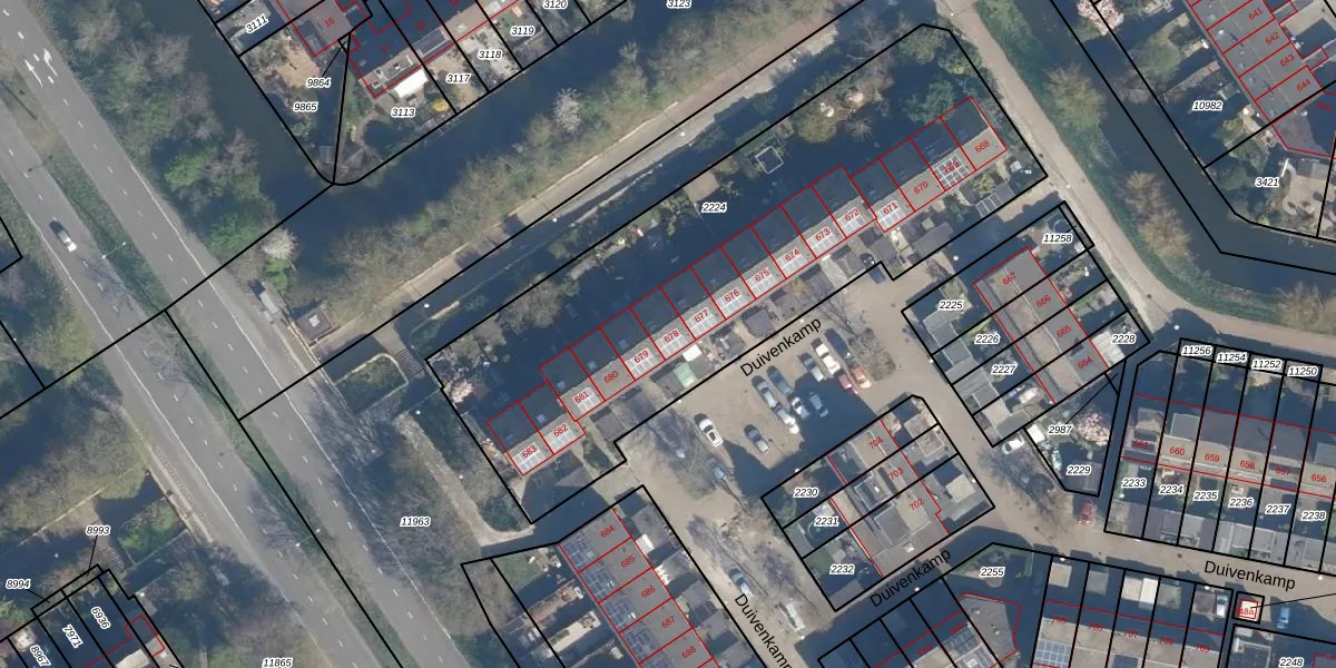 Het perceel waarop Duivenkamp 678 staat heeft een oppervlakte van 2574 m². Dit is een zeer groot perceel. De perceeloppervlakte wordt geregistreerd door het Kadaster. Gedetailleerde informatie over de maten van dit perceel kunt u vinden in het rapport Kadastrale kaart met maatvoering van Duivenkamp 678.