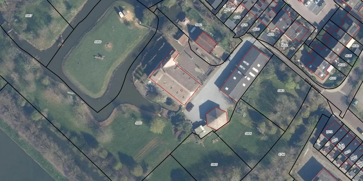 Het perceel waarop Straatweg 13 staat heeft een oppervlakte van 6697 m². Dit is een zeer groot perceel. De perceeloppervlakte wordt geregistreerd door het Kadaster. Gedetailleerde informatie over de maten van dit perceel kunt u vinden in het rapport Kadastrale kaart met maatvoering van Straatweg 13.