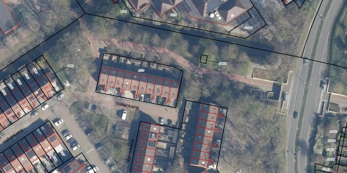 Het perceel waarop Valkenkamp 61 staat heeft een oppervlakte van 1084 m². Dit is een zeer groot perceel. De perceeloppervlakte wordt geregistreerd door het Kadaster. Gedetailleerde informatie over de maten van dit perceel kunt u vinden in het rapport Kadastrale kaart met maatvoering van Valkenkamp 61.