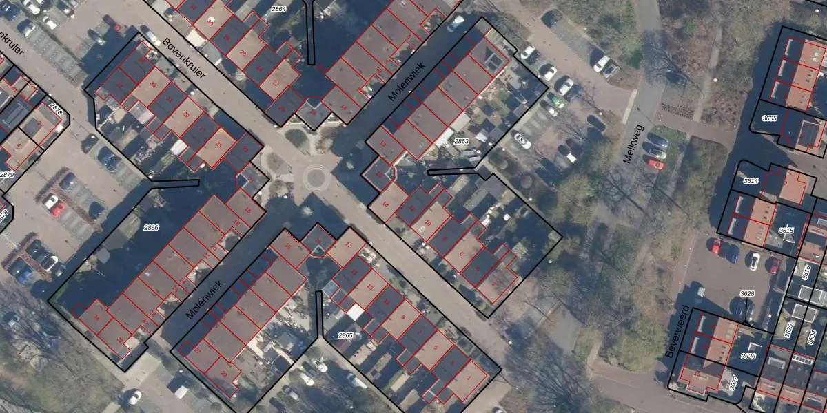 Het perceel waarop Bovenkruier 12 staat heeft een oppervlakte van 1835 m². Dit is een zeer groot perceel. De perceeloppervlakte wordt geregistreerd door het Kadaster. Gedetailleerde informatie over de maten van dit perceel kunt u vinden in het rapport Kadastrale kaart met maatvoering van Bovenkruier 12.