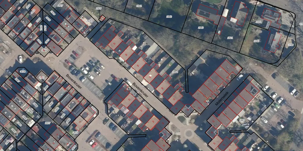 Het perceel waarop Bovenkruier 30 staat heeft een oppervlakte van 2770 m². Dit is een zeer groot perceel. De perceeloppervlakte wordt geregistreerd door het Kadaster. Gedetailleerde informatie over de maten van dit perceel kunt u vinden in het rapport Kadastrale kaart met maatvoering van Bovenkruier 30.