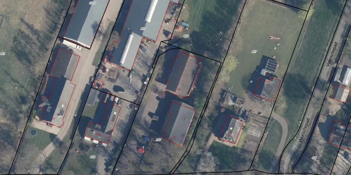 Het perceel waarop Dorpsweg 51 staat heeft een oppervlakte van 2455 m². Dit is een zeer groot perceel. De perceeloppervlakte wordt geregistreerd door het Kadaster. Gedetailleerde informatie over de maten van dit perceel kunt u vinden in het rapport Kadastrale kaart met maatvoering van Dorpsweg 51.