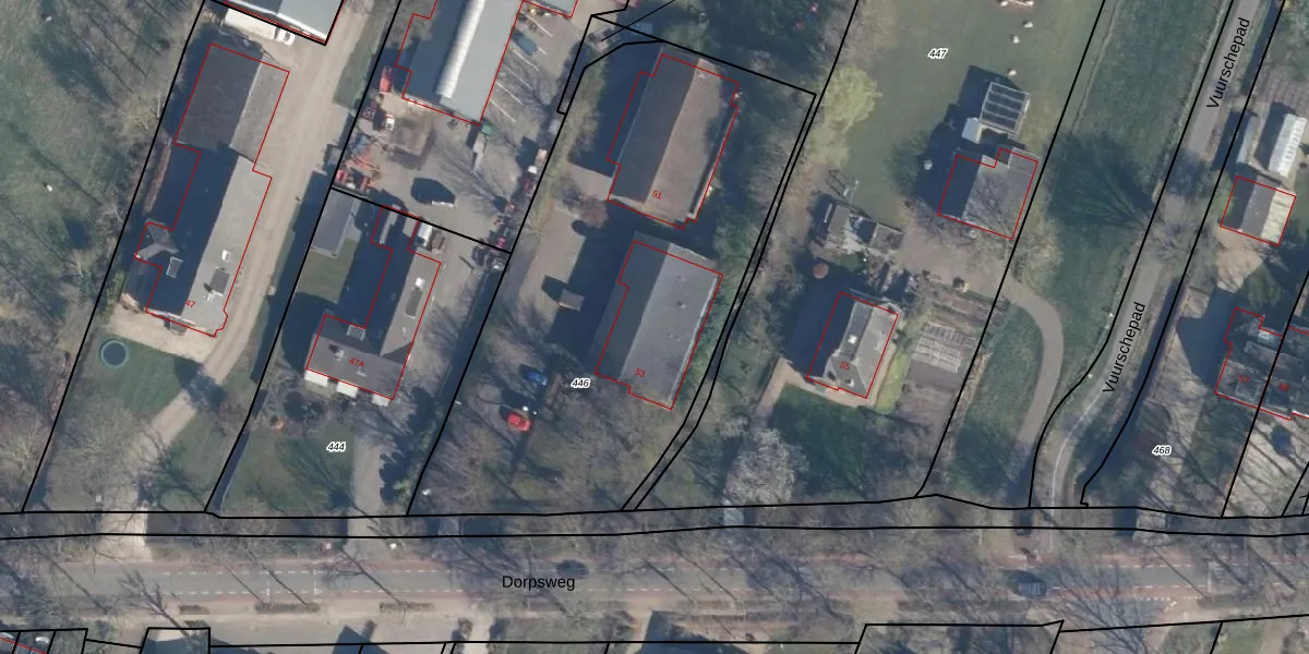Het perceel waarop Dorpsweg 53 staat heeft een oppervlakte van 2455 m². Dit is een zeer groot perceel. De perceeloppervlakte wordt geregistreerd door het Kadaster. Gedetailleerde informatie over de maten van dit perceel kunt u vinden in het rapport Kadastrale kaart met maatvoering van Dorpsweg 53.