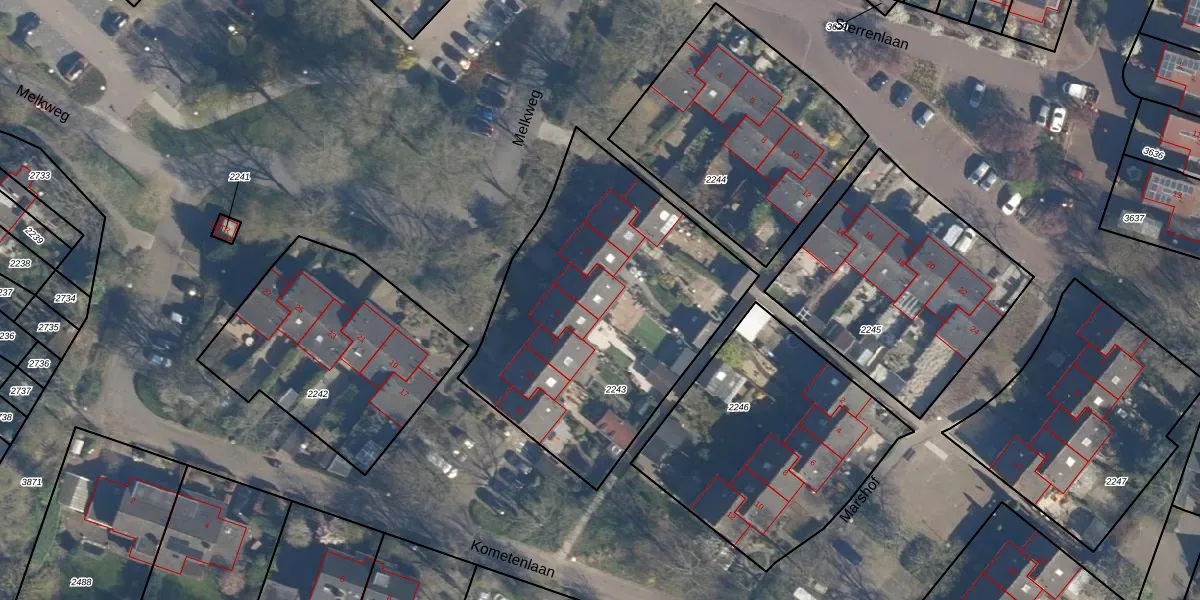 Het perceel waarop Melkweg 7 staat heeft een oppervlakte van 1515 m². Dit is een zeer groot perceel. De perceeloppervlakte wordt geregistreerd door het Kadaster. Gedetailleerde informatie over de maten van dit perceel kunt u vinden in het rapport Kadastrale kaart met maatvoering van Melkweg 7.