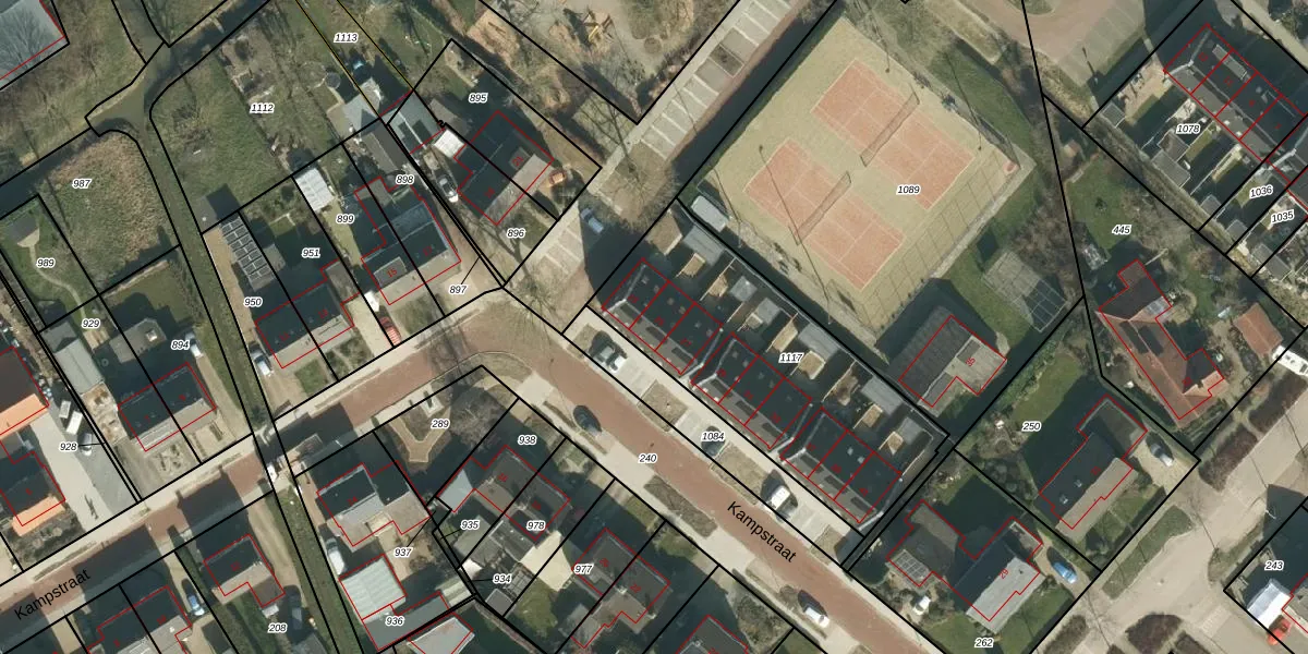 Het perceel waarop Kampstraat 25 staat heeft een oppervlakte van 1150 m². Dit is een zeer groot perceel. De perceeloppervlakte wordt geregistreerd door het Kadaster. Gedetailleerde informatie over de maten van dit perceel kunt u vinden in het rapport Kadastrale kaart met maatvoering van Kampstraat 25.