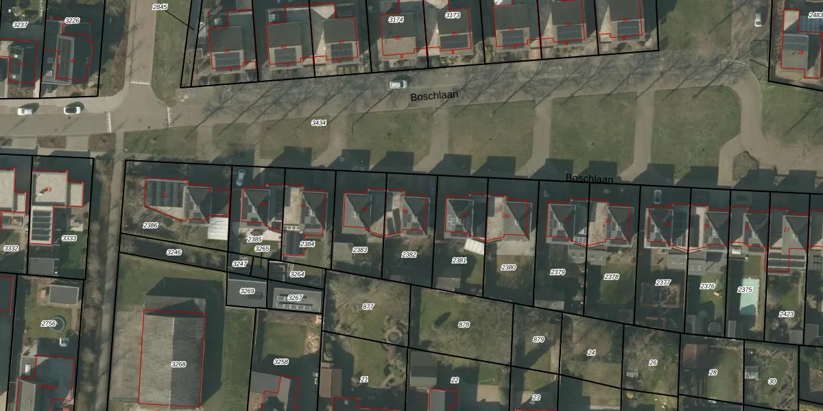 Boschlaan 43 is gelegen op kadastraal perceel MBE00K2382. Deze kadastrale aanduiding is uniek en wordt gebruikt door het Kadaster om eigendomsrechten en andere zakelijke rechten vast te leggen. Het perceel maakt onderdeel uit van de kadastrale gemeente Maasbree.
