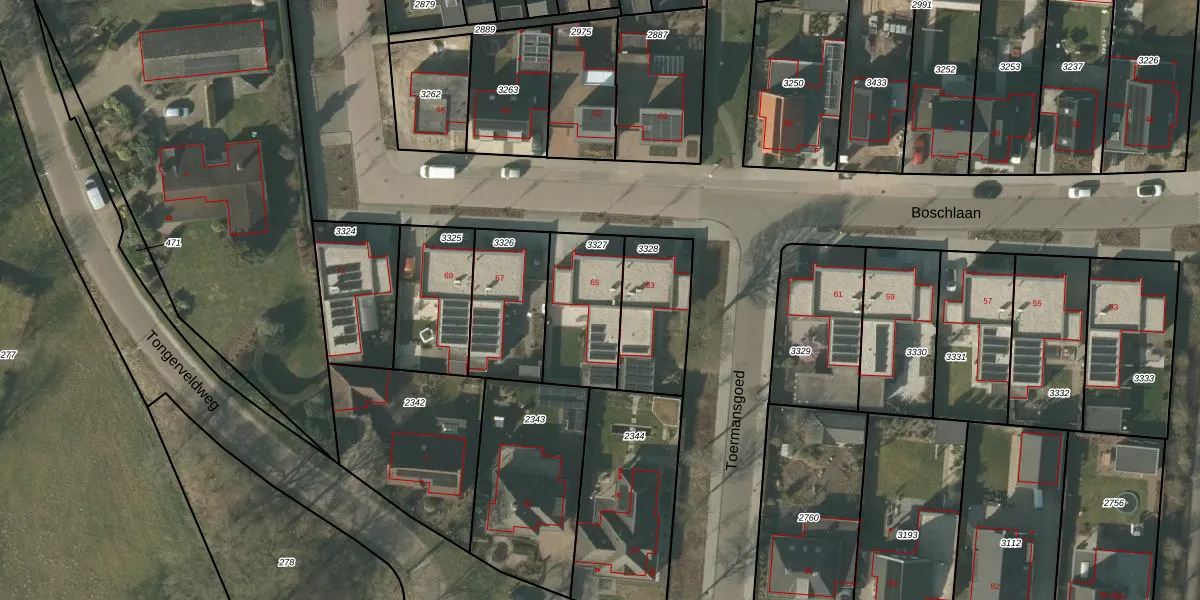 Boschlaan 65 is gelegen op kadastraal perceel MBE00K3327. Deze kadastrale aanduiding is uniek en wordt gebruikt door het Kadaster om eigendomsrechten en andere zakelijke rechten vast te leggen. Het perceel maakt onderdeel uit van de kadastrale gemeente Maasbree.