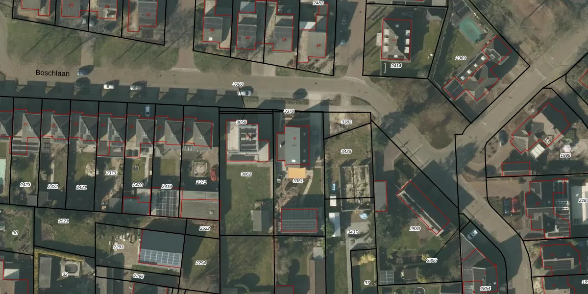 Boschlaan 9 is gelegen op kadastraal perceel MBE00K3381. Deze kadastrale aanduiding is uniek en wordt gebruikt door het Kadaster om eigendomsrechten en andere zakelijke rechten vast te leggen. Het perceel maakt onderdeel uit van de kadastrale gemeente Maasbree.
