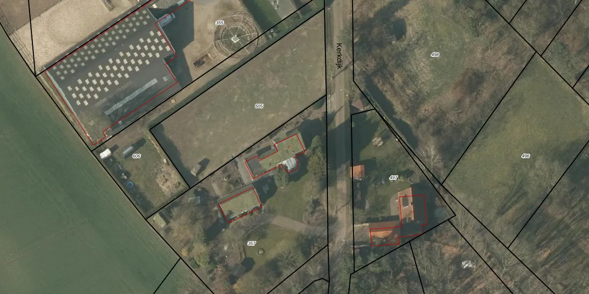 Het perceel waarop Kerkdijk 1 staat heeft een oppervlakte van 2493 m². Dit is een zeer groot perceel. De perceeloppervlakte wordt geregistreerd door het Kadaster. Gedetailleerde informatie over de maten van dit perceel kunt u vinden in het rapport Kadastrale kaart met maatvoering van Kerkdijk 1.