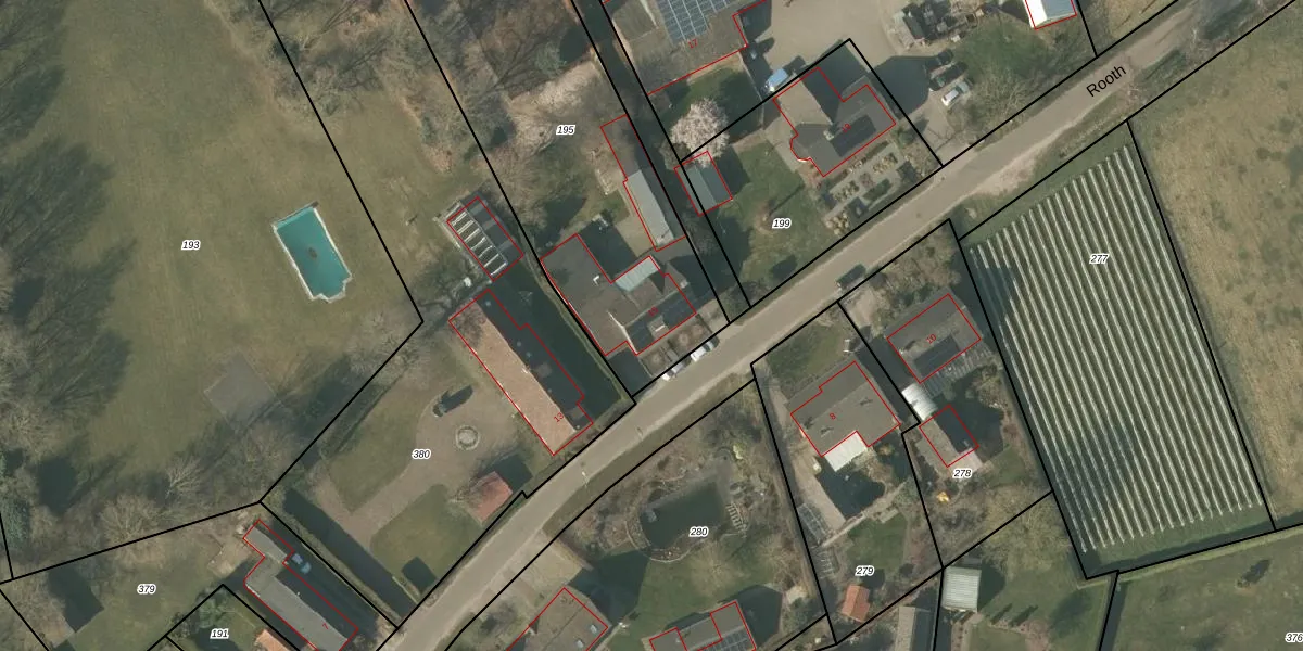Het perceel waarop Rooth 15 staat heeft een oppervlakte van 1963 m². Dit is een zeer groot perceel. De perceeloppervlakte wordt geregistreerd door het Kadaster. Gedetailleerde informatie over de maten van dit perceel kunt u vinden in het rapport Kadastrale kaart met maatvoering van Rooth 15.