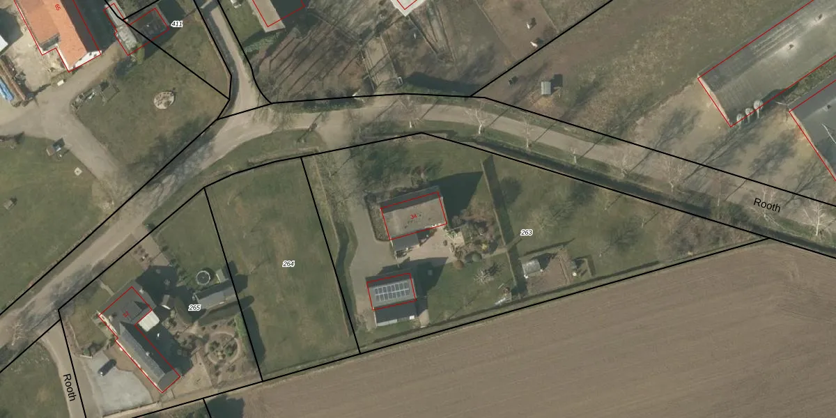 Het perceel waarop Rooth 34 staat heeft een oppervlakte van 3121 m². Dit is een zeer groot perceel. De perceeloppervlakte wordt geregistreerd door het Kadaster. Gedetailleerde informatie over de maten van dit perceel kunt u vinden in het rapport Kadastrale kaart met maatvoering van Rooth 34.