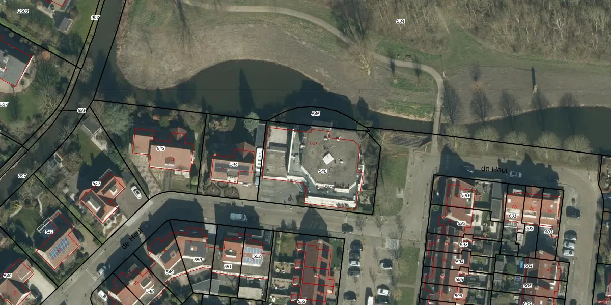 de Heul 1 is gelegen op kadastraal perceel MDM01G546. Deze kadastrale aanduiding is uniek en wordt gebruikt door het Kadaster om eigendomsrechten en andere zakelijke rechten vast te leggen. Het perceel maakt onderdeel uit van de kadastrale gemeente Maasdam.