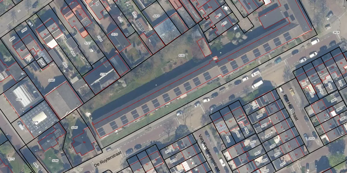 Het perceel waarop De Ruyterstraat 36 staat heeft een oppervlakte van 4678 m². Dit is een zeer groot perceel. De perceeloppervlakte wordt geregistreerd door het Kadaster. Gedetailleerde informatie over de maten van dit perceel kunt u vinden in het rapport Kadastrale kaart met maatvoering van De Ruyterstraat 36.