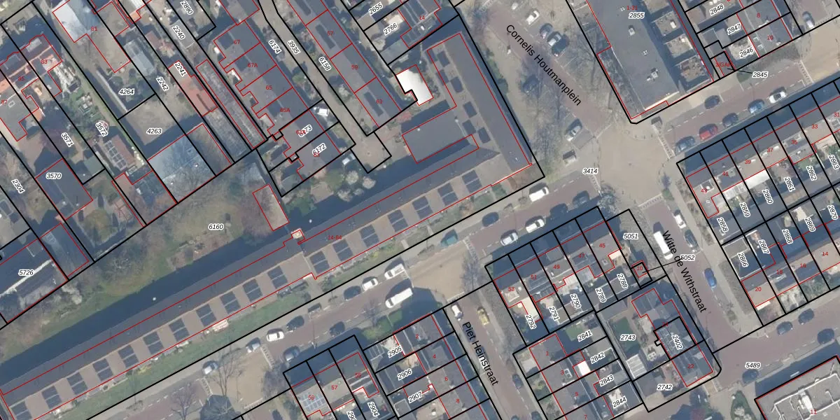 Het perceel waarop De Ruyterstraat 56 staat heeft een oppervlakte van 4678 m². Dit is een zeer groot perceel. De perceeloppervlakte wordt geregistreerd door het Kadaster. Gedetailleerde informatie over de maten van dit perceel kunt u vinden in het rapport Kadastrale kaart met maatvoering van De Ruyterstraat 56.