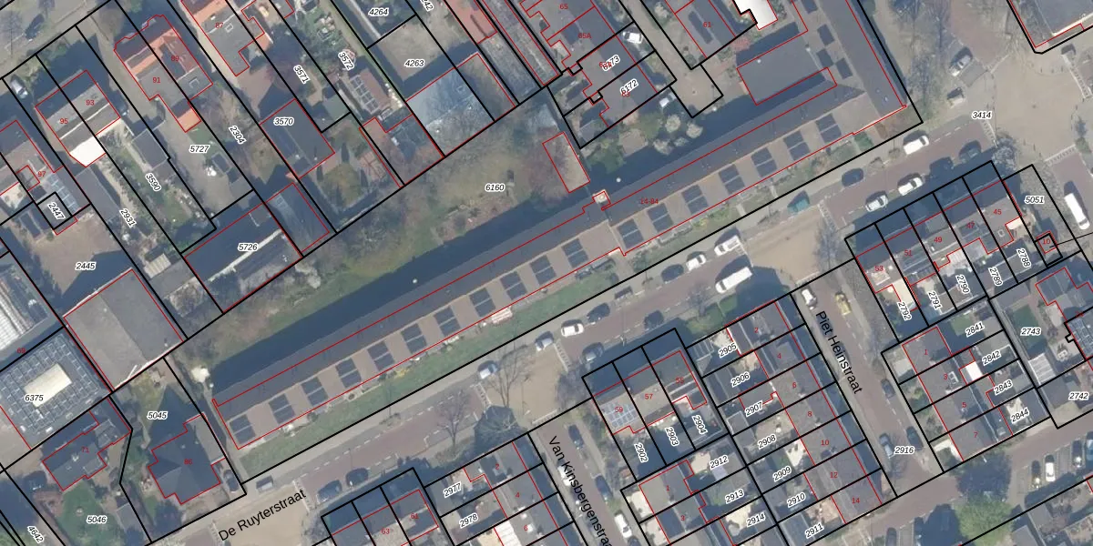 Het perceel waarop De Ruyterstraat 68 staat heeft een oppervlakte van 4678 m². Dit is een zeer groot perceel. De perceeloppervlakte wordt geregistreerd door het Kadaster. Gedetailleerde informatie over de maten van dit perceel kunt u vinden in het rapport Kadastrale kaart met maatvoering van De Ruyterstraat 68.
