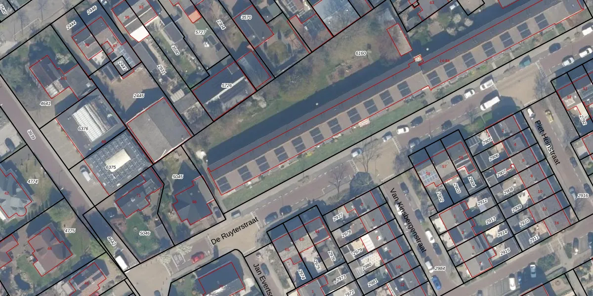 Het perceel waarop De Ruyterstraat 78 staat heeft een oppervlakte van 4678 m². Dit is een zeer groot perceel. De perceeloppervlakte wordt geregistreerd door het Kadaster. Gedetailleerde informatie over de maten van dit perceel kunt u vinden in het rapport Kadastrale kaart met maatvoering van De Ruyterstraat 78.