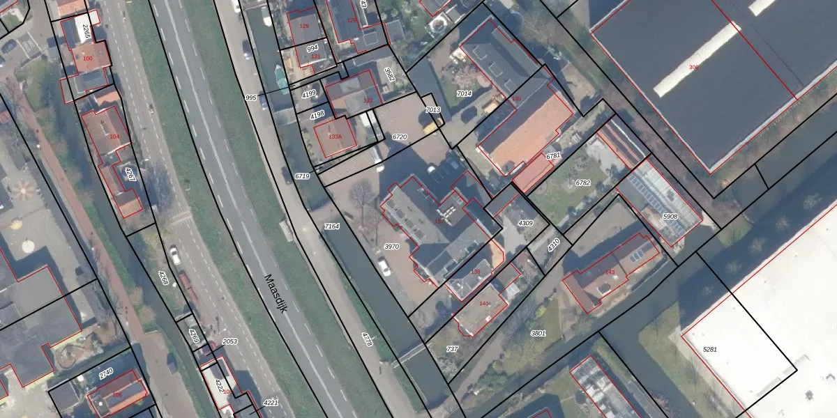Het perceel waarop Maasdijk 137-F staat heeft een oppervlakte van 976 m². Dit is een groot perceel. De perceeloppervlakte wordt geregistreerd door het Kadaster. Gedetailleerde informatie over de maten van dit perceel kunt u vinden in het rapport Kadastrale kaart met maatvoering van Maasdijk 137-F.