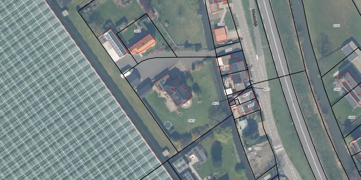 Maasdijk 58-B is gelegen op kadastraal perceel NWK01F5407. Deze kadastrale aanduiding is uniek en wordt gebruikt door het Kadaster om eigendomsrechten en andere zakelijke rechten vast te leggen. Het perceel maakt onderdeel uit van de kadastrale gemeente Naaldwijk.