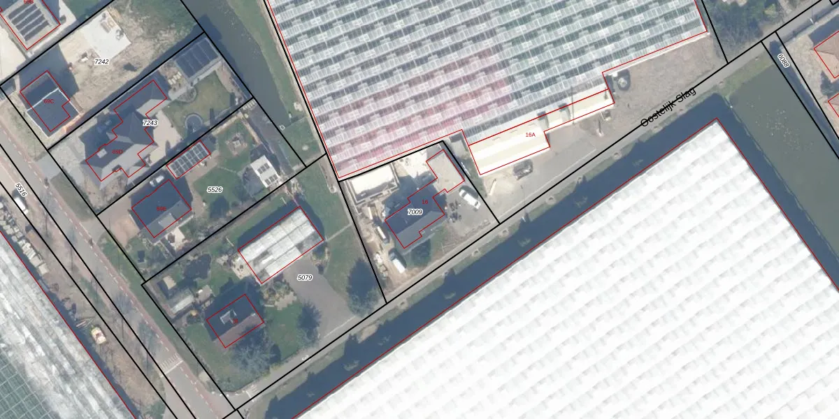 Oostelijk Slag 16 is gelegen op kadastraal perceel NWK01F7009. Deze kadastrale aanduiding is uniek en wordt gebruikt door het Kadaster om eigendomsrechten en andere zakelijke rechten vast te leggen. Het perceel maakt onderdeel uit van de kadastrale gemeente Naaldwijk.