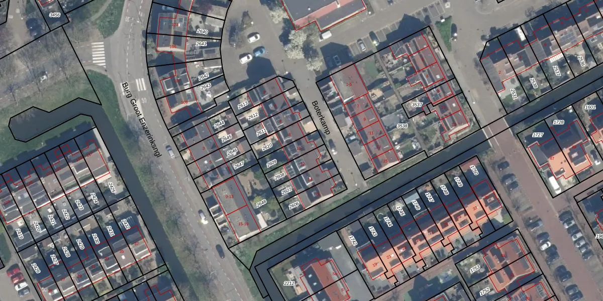 Gebruik de zoekbalk of klik op een perceel voor informatie over de adressen binnen dit perceel.