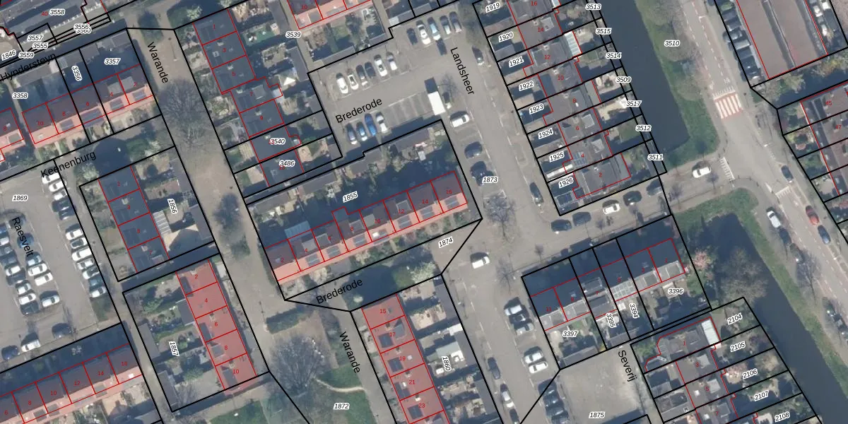 Brederode 14 is gelegen op kadastraal perceel MLD00C1855. Deze kadastrale aanduiding is uniek en wordt gebruikt door het Kadaster om eigendomsrechten en andere zakelijke rechten vast te leggen. Het perceel maakt onderdeel uit van de kadastrale gemeente Maasland.