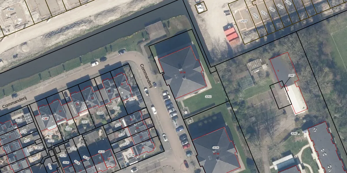 Het perceel waarop Commanderij 34 staat heeft een oppervlakte van 1275 m². Dit is een zeer groot perceel. De perceeloppervlakte wordt geregistreerd door het Kadaster. Gedetailleerde informatie over de maten van dit perceel kunt u vinden in het rapport Kadastrale kaart met maatvoering van Commanderij 34.