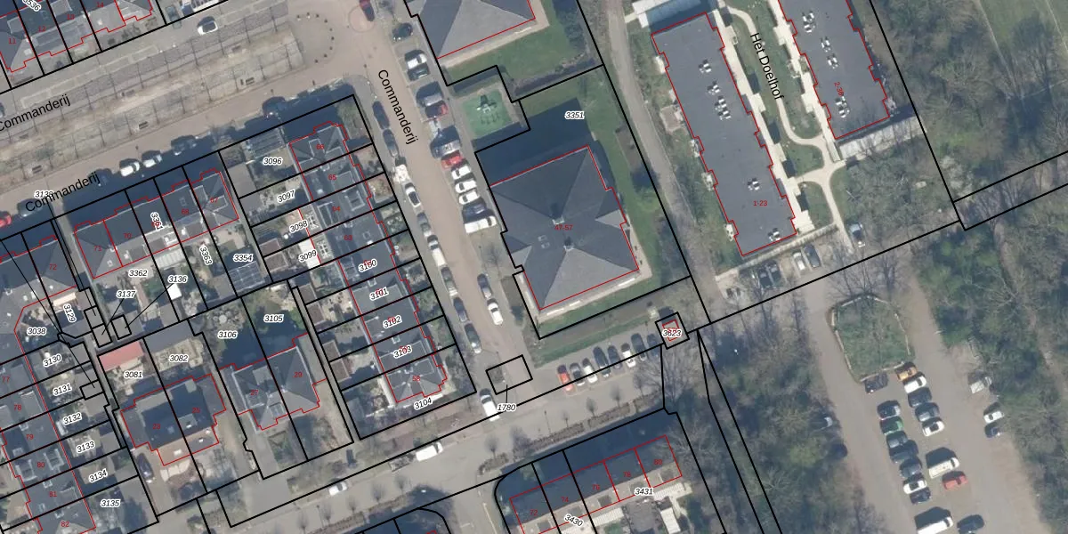 Het perceel waarop Commanderij 53 staat heeft een oppervlakte van 1200 m². Dit is een zeer groot perceel. De perceeloppervlakte wordt geregistreerd door het Kadaster. Gedetailleerde informatie over de maten van dit perceel kunt u vinden in het rapport Kadastrale kaart met maatvoering van Commanderij 53.