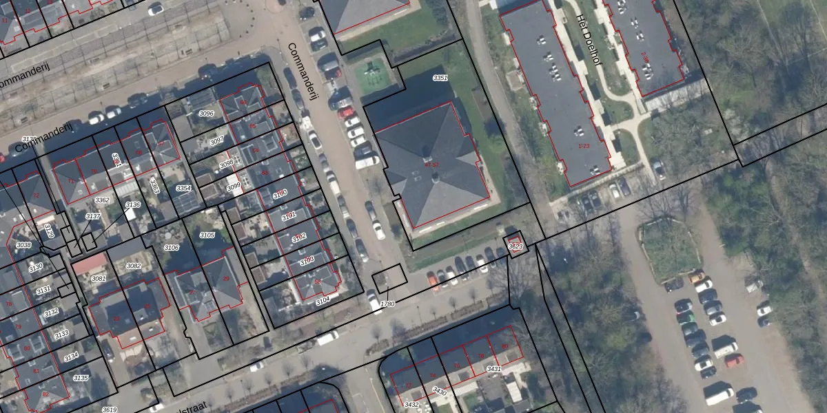 Het perceel waarop Commanderij 55 staat heeft een oppervlakte van 1200 m². Dit is een zeer groot perceel. De perceeloppervlakte wordt geregistreerd door het Kadaster. Gedetailleerde informatie over de maten van dit perceel kunt u vinden in het rapport Kadastrale kaart met maatvoering van Commanderij 55.