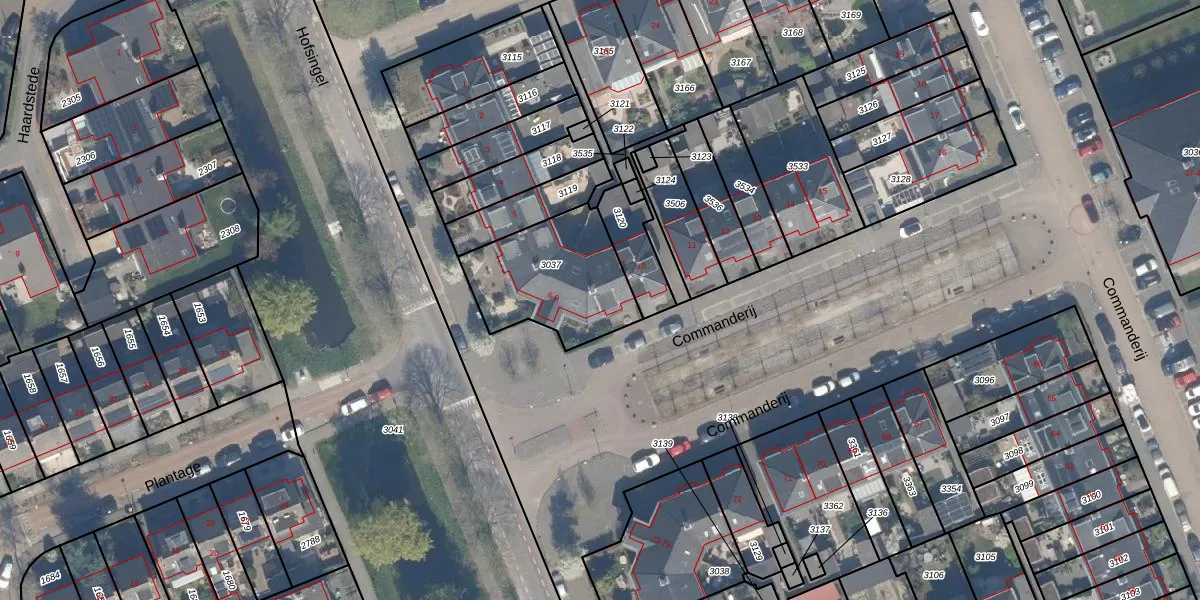 Het perceel waarop Commanderij 9 staat heeft een oppervlakte van 448 m². Dit is een groot perceel. De perceeloppervlakte wordt geregistreerd door het Kadaster. Gedetailleerde informatie over de maten van dit perceel kunt u vinden in het rapport Kadastrale kaart met maatvoering van Commanderij 9.