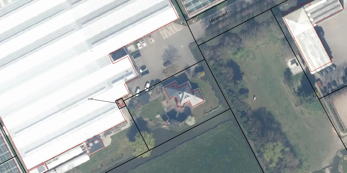 Herenwerf 55 is gelegen op kadastraal perceel MLD00I45. Deze kadastrale aanduiding is uniek en wordt gebruikt door het Kadaster om eigendomsrechten en andere zakelijke rechten vast te leggen. Het perceel maakt onderdeel uit van de kadastrale gemeente Maasland.
