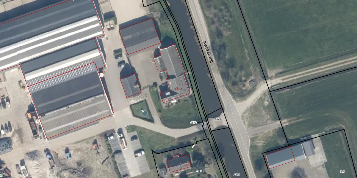 Het perceel waarop Kwakelweg 12-b staat heeft een oppervlakte van 8,1 ha. Dit is een zeer groot perceel. De perceeloppervlakte wordt geregistreerd door het Kadaster. Gedetailleerde informatie over de maten van dit perceel kunt u vinden in het rapport Kadastrale kaart met maatvoering van Kwakelweg 12-b.
