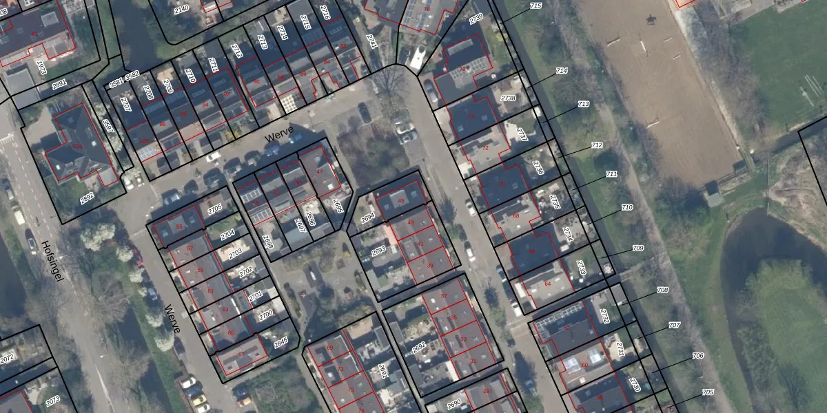 Het perceel waarop Werve 45 staat heeft een oppervlakte van 157 m². Dit is een middelgroot perceel. De perceeloppervlakte wordt geregistreerd door het Kadaster. Gedetailleerde informatie over de maten van dit perceel kunt u vinden in het rapport Kadastrale kaart met maatvoering van Werve 45.