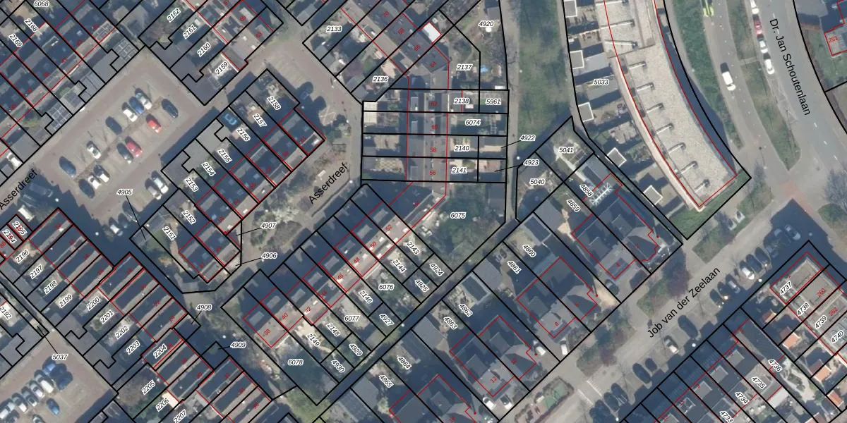 Asserdreef 54 is gelegen op kadastraal perceel MSS00A6075. Deze kadastrale aanduiding is uniek en wordt gebruikt door het Kadaster om eigendomsrechten en andere zakelijke rechten vast te leggen. Het perceel maakt onderdeel uit van de kadastrale gemeente Maassluis.