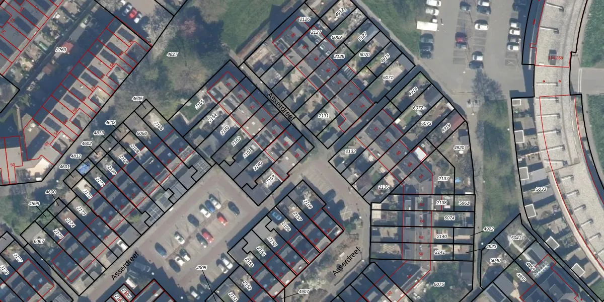 Het perceel waarop Asserdreef 63 staat heeft een oppervlakte van 165 m². Dit is een middelgroot perceel. De perceeloppervlakte wordt geregistreerd door het Kadaster. Gedetailleerde informatie over de maten van dit perceel kunt u vinden in het rapport Kadastrale kaart met maatvoering van Asserdreef 63.