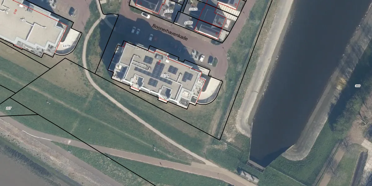 Het perceel waarop Boonerhavenkade 12 staat heeft een oppervlakte van 1289 m². Dit is een zeer groot perceel. De perceeloppervlakte wordt geregistreerd door het Kadaster. Gedetailleerde informatie over de maten van dit perceel kunt u vinden in het rapport Kadastrale kaart met maatvoering van Boonerhavenkade 12.
