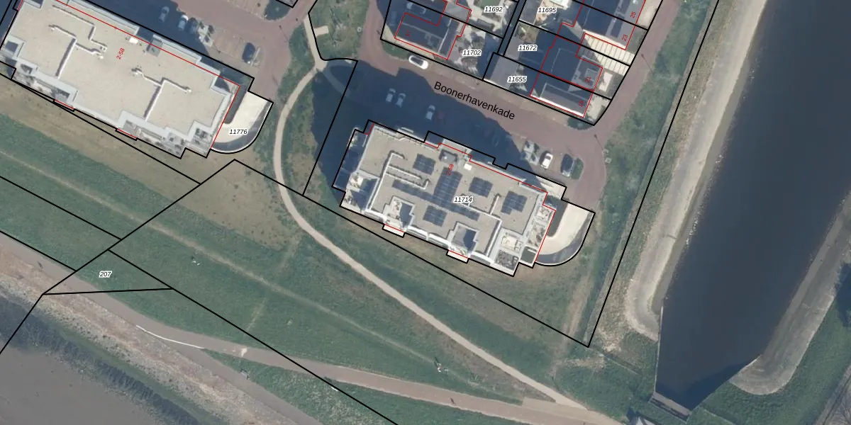 Het perceel waarop Boonerhavenkade 44 staat heeft een oppervlakte van 1289 m². Dit is een zeer groot perceel. De perceeloppervlakte wordt geregistreerd door het Kadaster. Gedetailleerde informatie over de maten van dit perceel kunt u vinden in het rapport Kadastrale kaart met maatvoering van Boonerhavenkade 44.