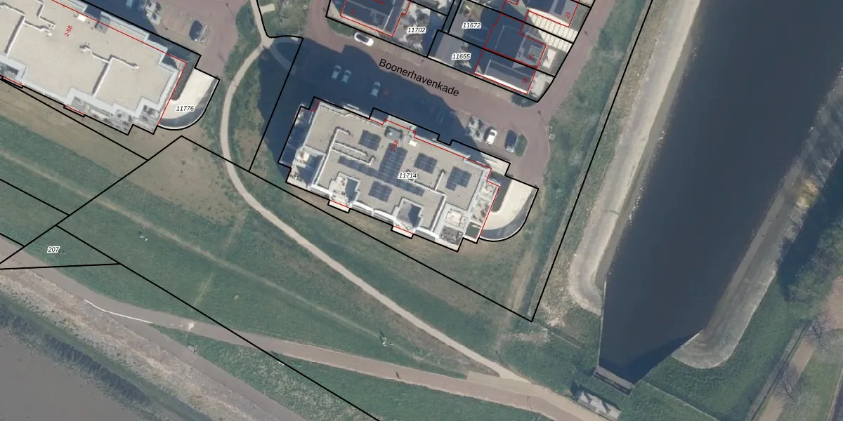 Het perceel waarop Boonerhavenkade 46 staat heeft een oppervlakte van 1289 m². Dit is een zeer groot perceel. De perceeloppervlakte wordt geregistreerd door het Kadaster. Gedetailleerde informatie over de maten van dit perceel kunt u vinden in het rapport Kadastrale kaart met maatvoering van Boonerhavenkade 46.