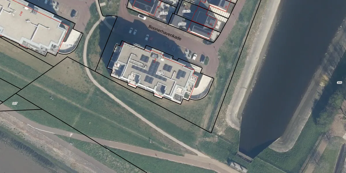 Het perceel waarop Boonerhavenkade 48 staat heeft een oppervlakte van 1289 m². Dit is een zeer groot perceel. De perceeloppervlakte wordt geregistreerd door het Kadaster. Gedetailleerde informatie over de maten van dit perceel kunt u vinden in het rapport Kadastrale kaart met maatvoering van Boonerhavenkade 48.